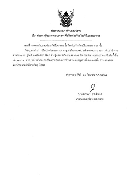 ประกาศผู้ชนะการเสนอราคา ซื้อวัสดุก่อสร้าง โดยวิธีเฉพาะเจาะจง