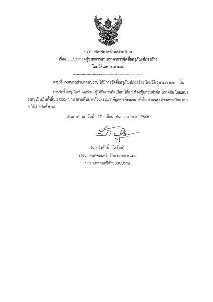 ประกาศผู้ชนะการเสนอราคาการจัดซื้อครุภัณฑ์ก่อสร้าง โดยวิธีเฉพาะเจาะจง