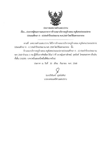 ประกาศผู้ชนะการเสนอราคาการจ้างเหมาบริการครูจ้างสอน ครูพิเศษประถมปลาย (ประถมศึกษา 4 - 6)ประจำปีงบประมาณ พ.ศ.2569 โดยวิธีเฉพาะเจาะจง