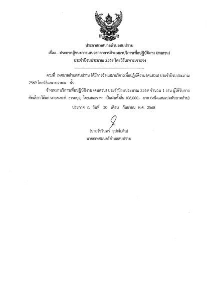 ประกาศผู้ชนะการเสนอราคาการจ้างเหมาบริการเพื่อปฏิบัติงาน (คนสวน) ประจำปีงบประมาณ 2569 โดยวิธีเฉพาะเจาะจง
