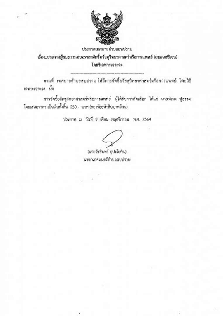 เรื่อง..ประกาศผู้ชนะการเสนอราคาจัดซื้อวัสดุวิทยาศาสตร์หรือการแพทย์ (ลมออกซิเจน) โดยเฉพาะเจาะจง