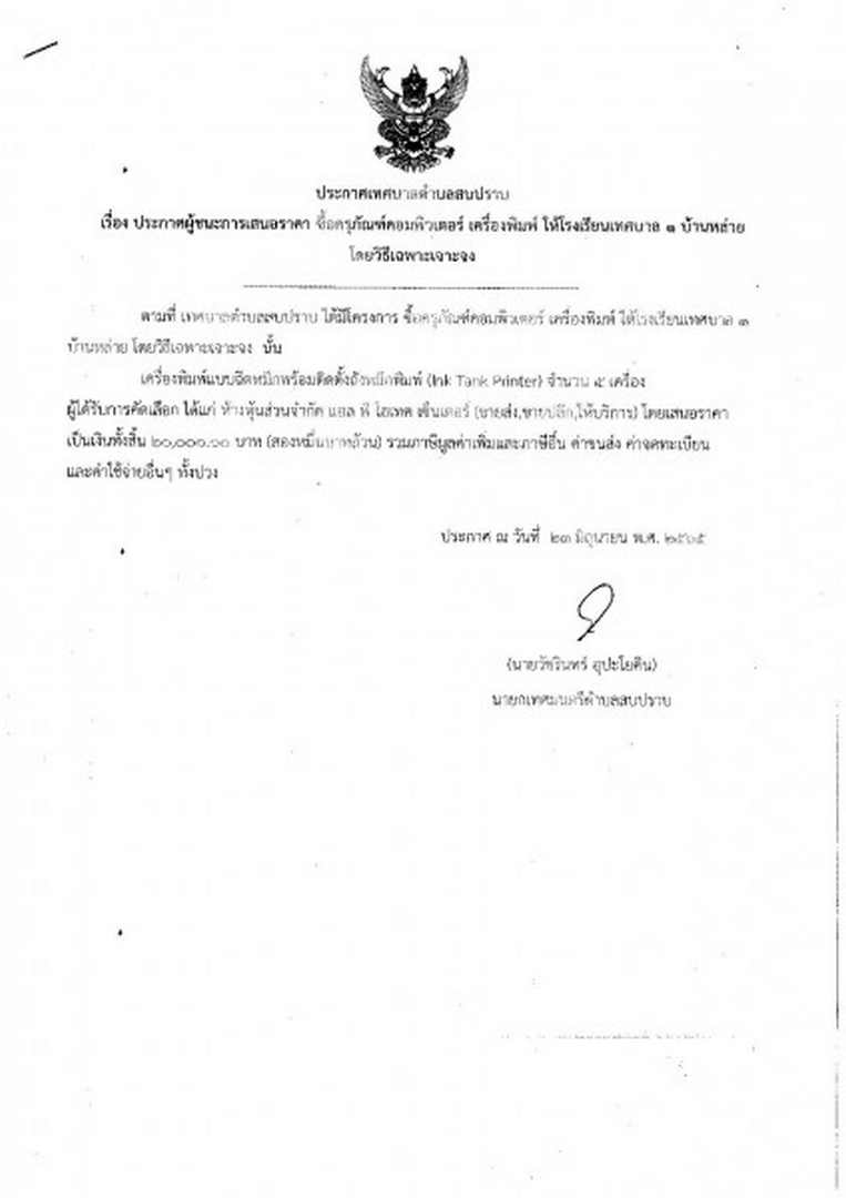ประกาศผู้ชนะการเสนอราคา ซื้อครุภัณฑ์คอมพิวเตอร์ เครื่องพิมพ์ ให้โรงเรียนเทศบาล ๑ บ้านหล่าย โดยวิธีเฉพาะเจาะจง