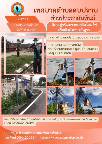 ติดโคมไฟส่องสว่างทางสัญจรบริเวณทางแยกซอย6 และแยกหน้าการไฟฟ้าอำเภอสบปราบ เพื่อเพิ่มแสงสว่างในพื้นที่สาธารณะ ลดความเสี่ยงอันตราย และสร้างความมั่นใจให้ประชาชน