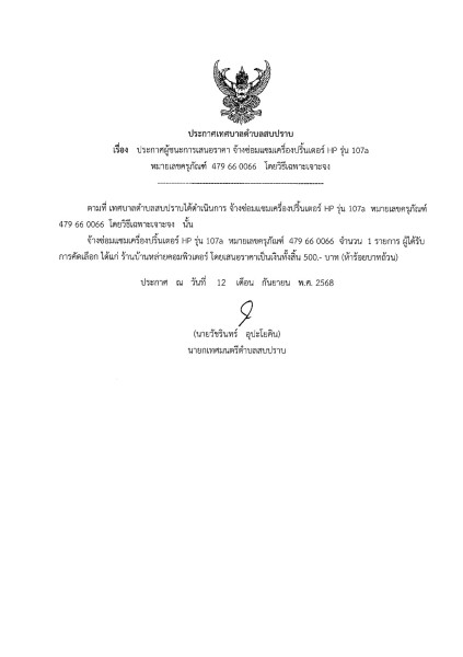 ประกาศผู้ชนะการเสนอราคา จ้างซ่อมแซมเครื่องปริ้นเตอร์ HP รุ่น 107a หมายเลขครุภัณฑ์ 479 66 0066 โดยวิธีเฉพาะเจาะจง