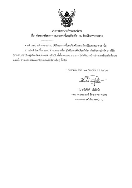 ประกาศผู้ชนะการเสนอราคา ซื้อครุภัณฑ์โรงงาน โดยวิธีเฉพาะเจาะจง
