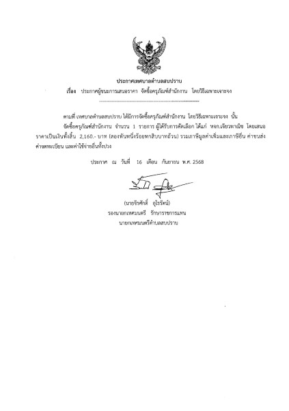 ประกาศผู้ชนะการเสนอราคา จัดซื้อครุภัณฑ์สำนักงาน โดยวิธีเฉพาะเจาะจง