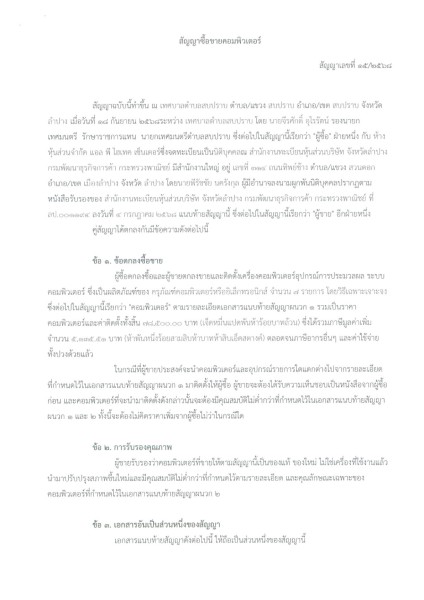 สัญญาซื้อขายคอมพิวเตอร์ สัญญาเลขที่ ๑๕/๒๕๖๘ ลงวันที่ ๑๘ กันยายน พ.ศ.๒๕๖๘ เรื่อง ผู้ซื้อตกลงซื้อและผู้ขายตกลงขายและติดตั้งเครื่องคอมพิวเตอร์อุปกรณ์การประมวลผล ระบบ คอมพิวเตอร์ ซึ่งเป็นผลิตภัณฑ์ของ ครุภัณฑ์คอมพิวเตอร์หรืออิเล็กทรอนิกส์ จำนวน ๗ รายการ โดยวิธีเฉพาะเจาะจง