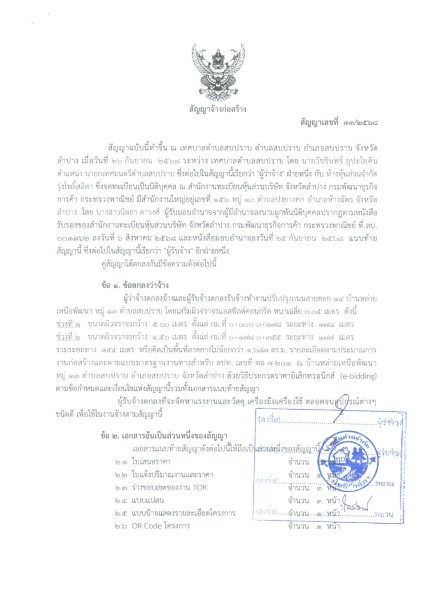 สัญญาจ้างก่อสร้าง สัญญาเลขที่ ๓๓/๒๕๖๘ ลงวันที่ ๒๖ กันยายน พ.ศ.๒๕๖๘ เรื่อง ผู้ว่าจ้างตกลงจ้างและผู้รับจ้างตกลงรับจ้างทำงานปรับปรุงถนนสายซอย ๑๔ บ้านหล่าย เหนือพัฒนา หมู่ ๑๓ ตำบลสบปราบ ฯ ด้วยวิธีประกวดราคาอิเล็กทรอนิกส์ (e-bidding)