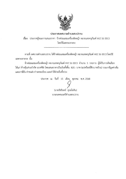 ประกาศผู้ชนะการเสนอราคา จ้างซ่อมแซมเครื่องตัดหญ้า หมายเลขครุภัณฑ์ 442 56 0013 โดยวิธีเฉพาะเจาะจง