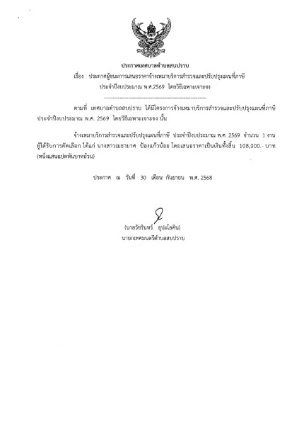 ประกาศผู้ชนะการเสนอราคาจ้างเหมาบริการสำรวจและปรับปรุงแผนที่ภาษี ประจำปีงบประมาณ พ.ศ.2569 โดยวิธีเฉพาะเจาะจง