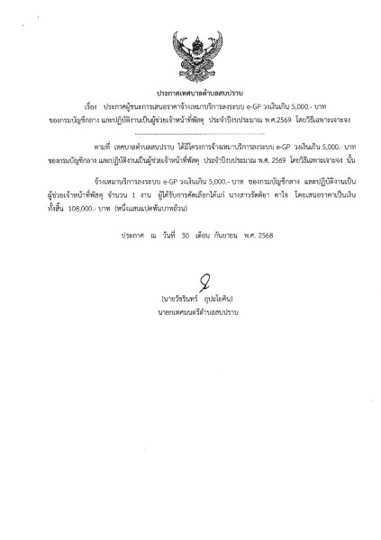 ประกาศผู้ชนะการเสนอราคาจ้างเหมาบริการลงระบบ e-GP วงเงินเกิน 5,000 .- บาท ของกรมบัญชีกลาง และปฏิบัติงานเป็นผู้ช่วยเจ้าหน้าที่พัสดุ ประจำปีงบประมาณ พ.ศ.2569 โดยวิธีเฉพาะเจาะจง
