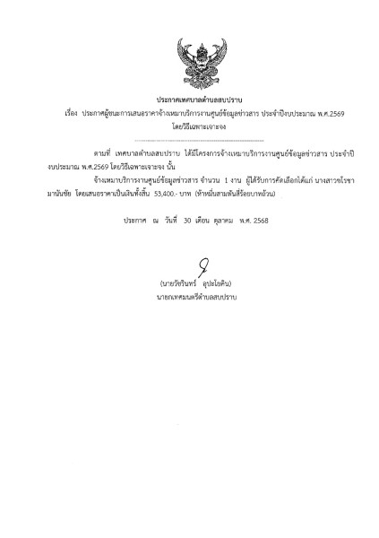 📣 ประกาศผู้ชนะการเสนอราคาจ้างเหมาบริการงานศูนย์ข้อมูลข่าวสาร ประจำปีงบประมาณ พ.ศ.2569 โดยวิธีเฉพาะเจาะจง