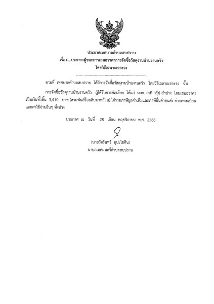 📣 ประกาศผู้ชนะการเสนอราคาการจัดซื้อวัสดุงานบ้านงานครัว โดยวิธีเฉพาะเจาะจง