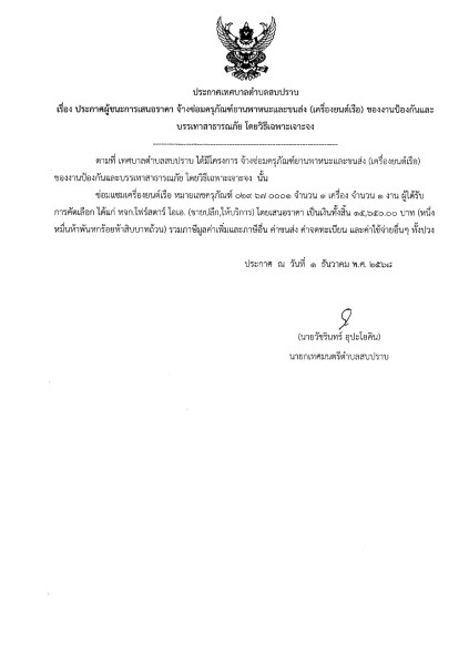 📣 ประกาศผู้ชนะการเสนอราคา จ้างซ่อมครุภัณฑ์ยานพาหนะและขนส่ง (เครื่องยนต์เรือ) ของงานป้องกันและบรรเทาสาธารณภัย โดยวิธีเฉพาะเจาะจง